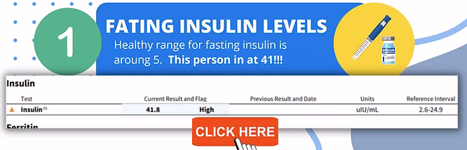 This patient I examined in the video had a fasting insulin level of 41. I like to describe insulin as glass shards in your bloodstream, causing all kinds of damage and causing a lot of chronic inflammation. Now this patient is at 4.8.