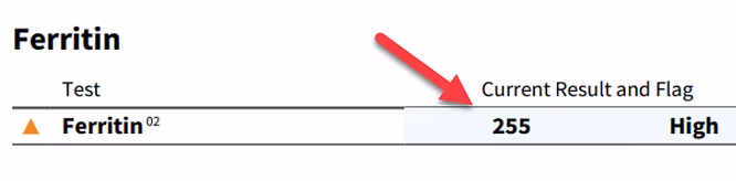 This patient’s ferritin levels were at 255. Ferritin can also be heavily influenced by diet, and is easy to manipulate. Roughly 20% of my clients end up having high ferritin levels. The problem is that ferritin is quite often overlooked in the conventional medical system.