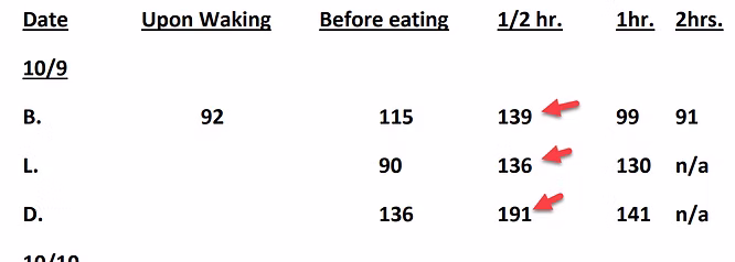 This pattern of carb-heavy meals went on throughout most of her days. When the patient came to me with all of these sugar spikes, we were able to pinpoint exactly what the cause was by looking at her journal.