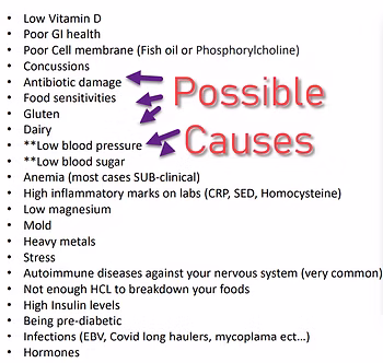 From my experience, I’ve found that 100% of my clients with dysautonomia have at least one contributing factor affecting their nervous system. These causes range from minor issues to more severe health problems. Some common triggers for dysautonomia include:
