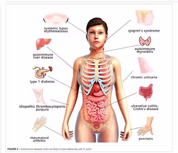 Research connects H. Pylori to Rheumatoid arthritis, Lupus, Type 1 diabetes, Sjogren's Syndrome, autoimmune thyroiditis, Crohn's disease, psoriasis, thrombocytopenia, and chronic urticaria through gut disruption and systemic inflammation.