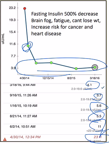 Let’s begin by discussing one of my clients who was experiencing significant health issues. His lab results revealed an insulin level of 38, a remarkably high figure that went unnoticed until then.