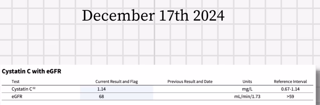I took three rounds of labs in December. The first test revealed a GFR (Glomerular Filtration Rate) of 59—a major kidney function marker that should be above 90. Worse, my creatinine was at 1.43, signaling kidney stress.