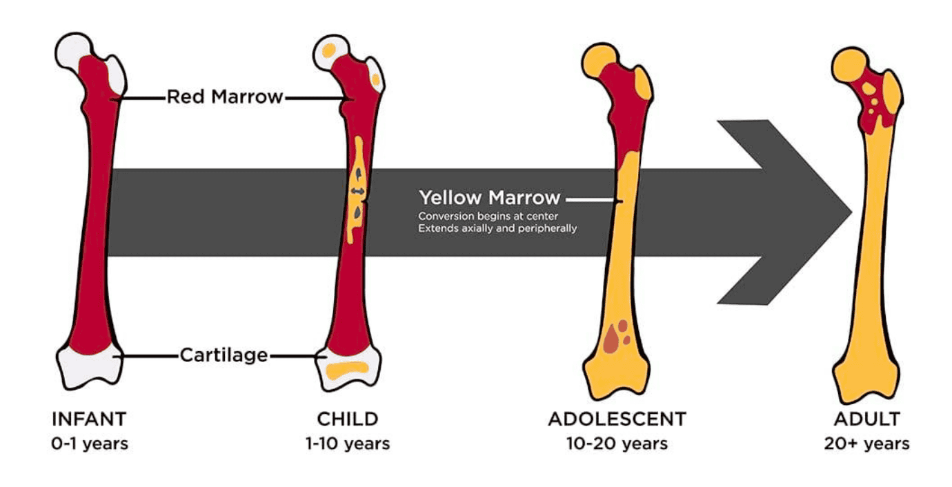As you age or deal with chronic inflammation, that red bone marrow slowly turns into yellow marrow, which is mostly fat.