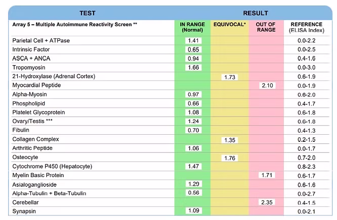 The Array 5 (Multiple Autoimmune Reactivity Screen) is a comprehensive blood test that examines antibodies against a wide range of body tissues. It helps identify underlying autoimmune reactions that may be driving chronic symptoms. In this case, it tested for reactivity against myocardial (heart) peptide, arthritic peptide, cerebellar, and other tissues.