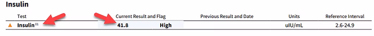 The next marker I want to look at is extremely critical: insulin. I’ve written about insulin many times, and spoken about it a lot in my videos. A conventional range for insulin is 2.6-25, though I like to see it closer to 5. This patient’s insulin reading was 41.8.