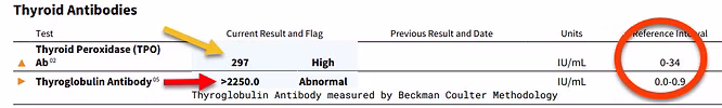 Another vital figure? The thyroid peroxidase or TPO. His score? **297**. The goal? **Below 34**.